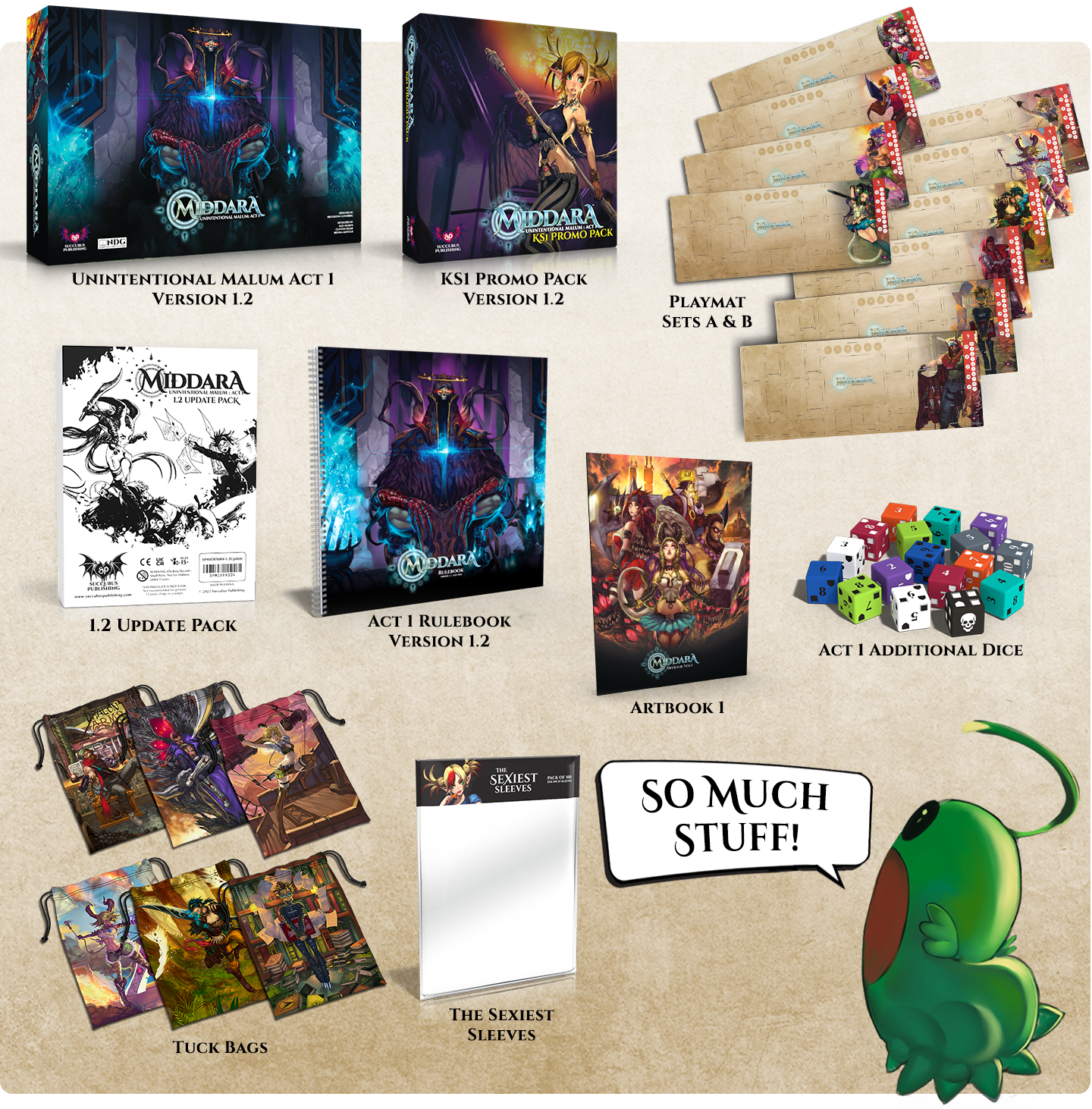 Examples of this are Extra Dice, Playmats, Art Books, and Token Upgrade Packs.